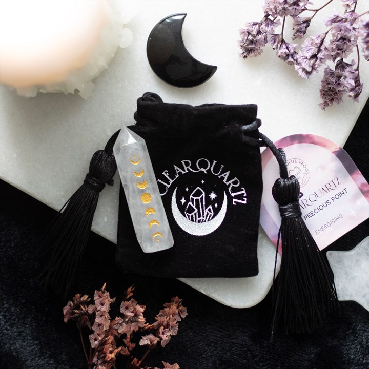 This beautiful clear quartz crystal point is perfect in size for travel altars, desk decor or taking on the go for extra protection. Features a gold-tone moon phase engraving and comes with a matching drawstring bag for storage and safe-keeping. .