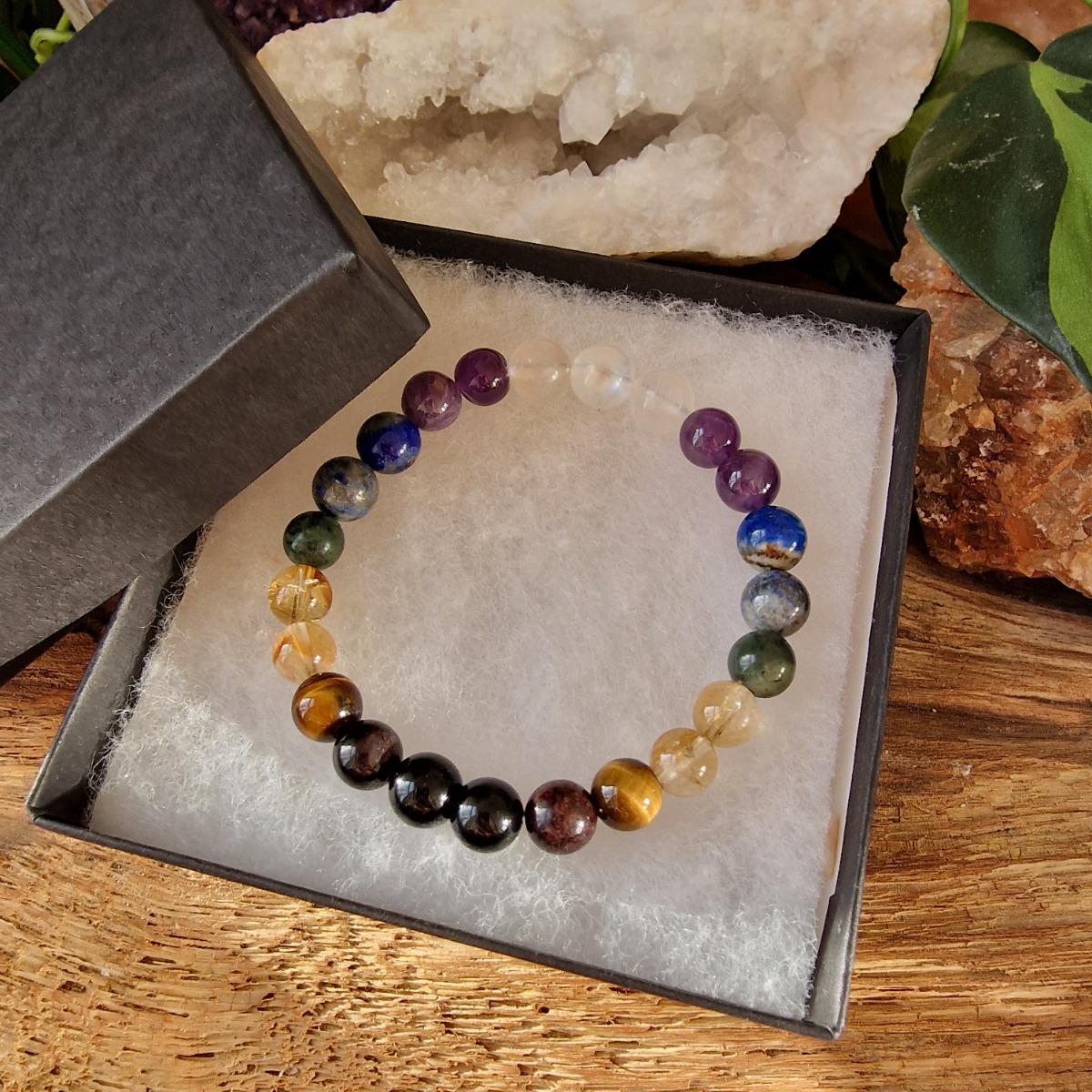 This powerful healing crystal bracelet is made with natural high-quality crystal beads of Obsidian, Garnet, Tiger Eye, Citrine, Jade, Lapis Lazuli, Amethyst, and Moonstone. The Chakra Clearing bracelet combines key high-vibrational crystals to support you in clearing the blocked energy centres and reinforcing energy flow whether during meditation, yoga, or throughout the day. Allow the healing energies of these crystals to support you on your journey towards holistic wellness.