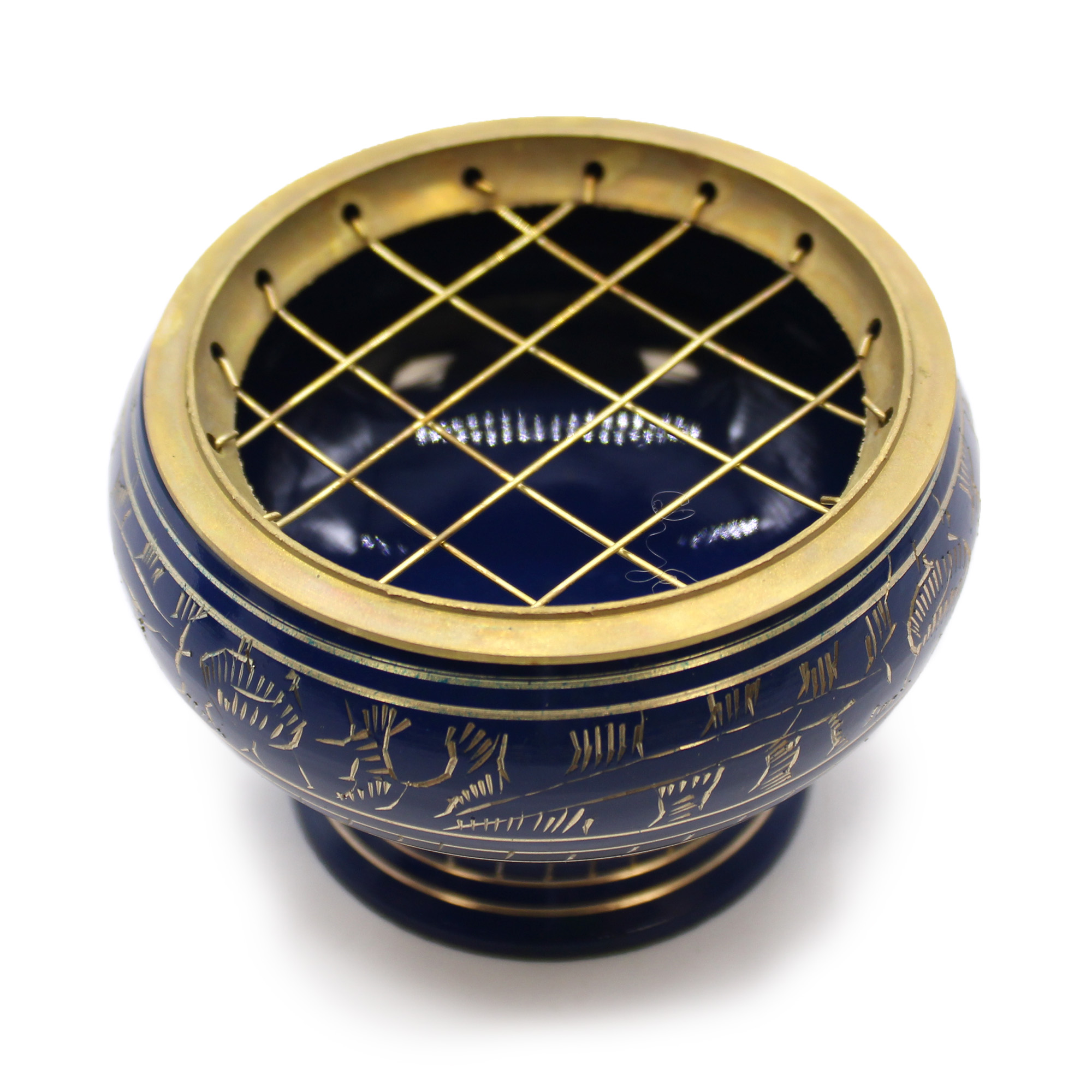 Charcoal Incense Jar in beautiful dark blue colour, with a slightly higher base. Decorated with golden patterns, handmade in India. This incense jar can be used during rituals for purification or activation of the Throat chakra.