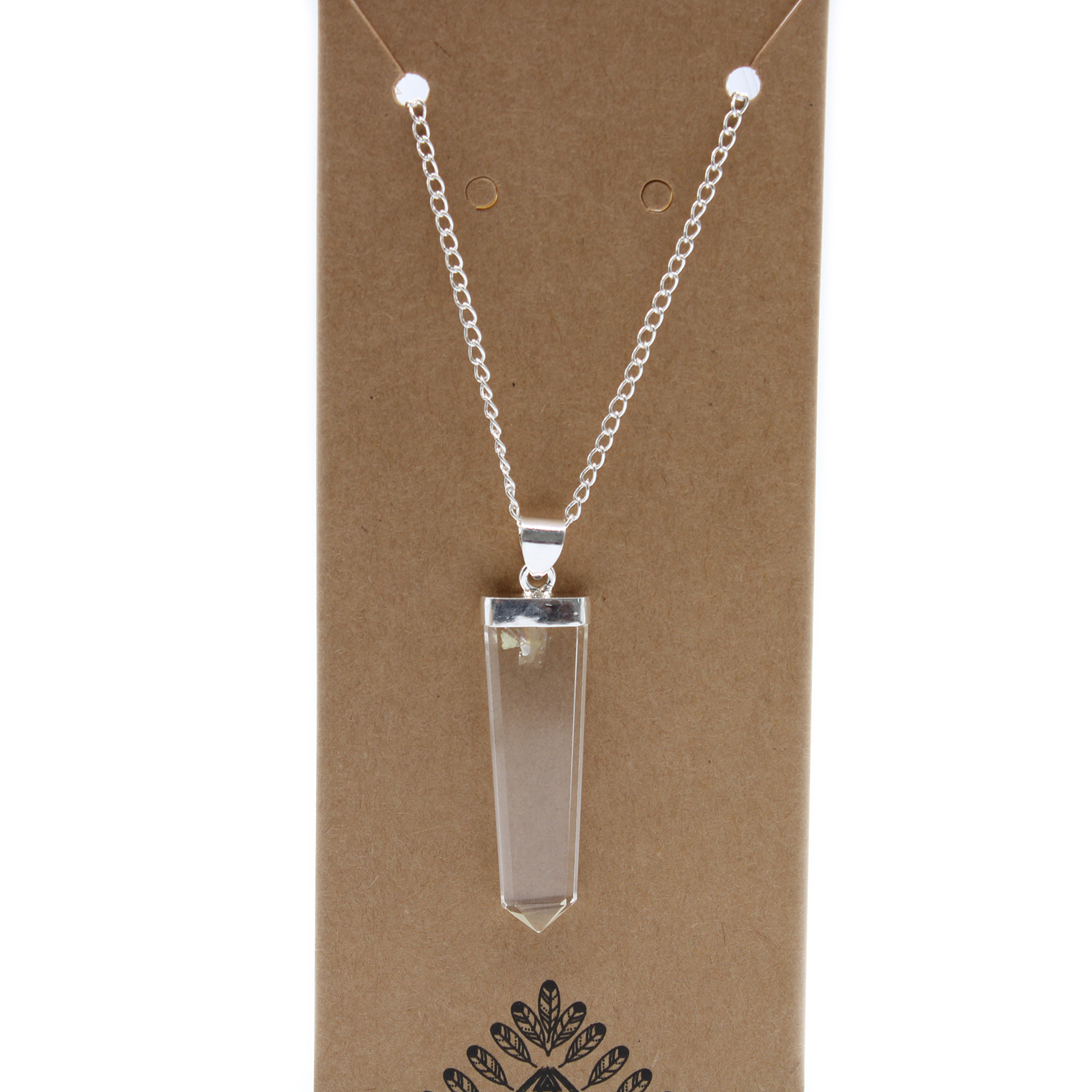 The Gemstone Flat Pencil Pendant features a polished Rock Quartz gemstone in a sleek and slender pencil shape.