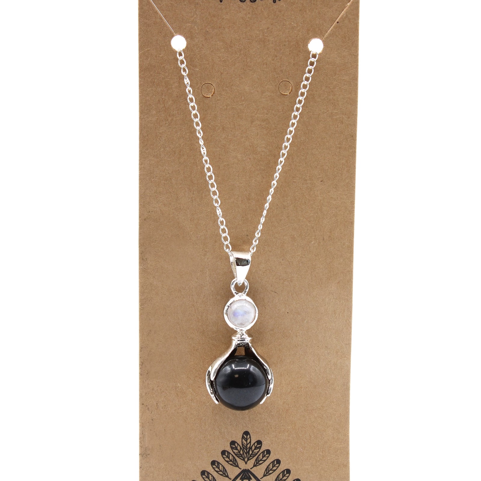 The Gemstone Healing Hands Pendant features a polished Black Agate gemstone in a sphere shape.