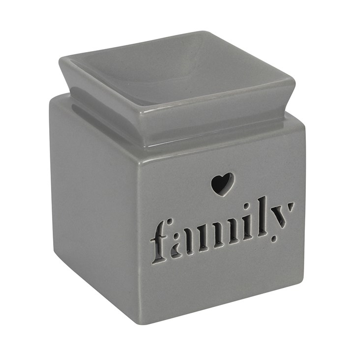 This light grey ceramic oil burner features a cutout heart and 'family' text in a cute, contemporary design. Place fragrance oil or wax melts into the built-in dish with a standard tealight inside to fill the home with calming fragrance. Product Dimensions: H11.