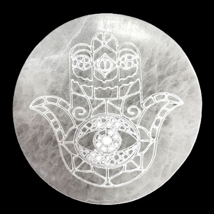 The Selenite Charging Plate is a stunning and functional piece of home decor made from natural selenite, a translucent mineral with calming and soothing properties. This charging plate measures 10cm in diameter and features a unique hamsa design.