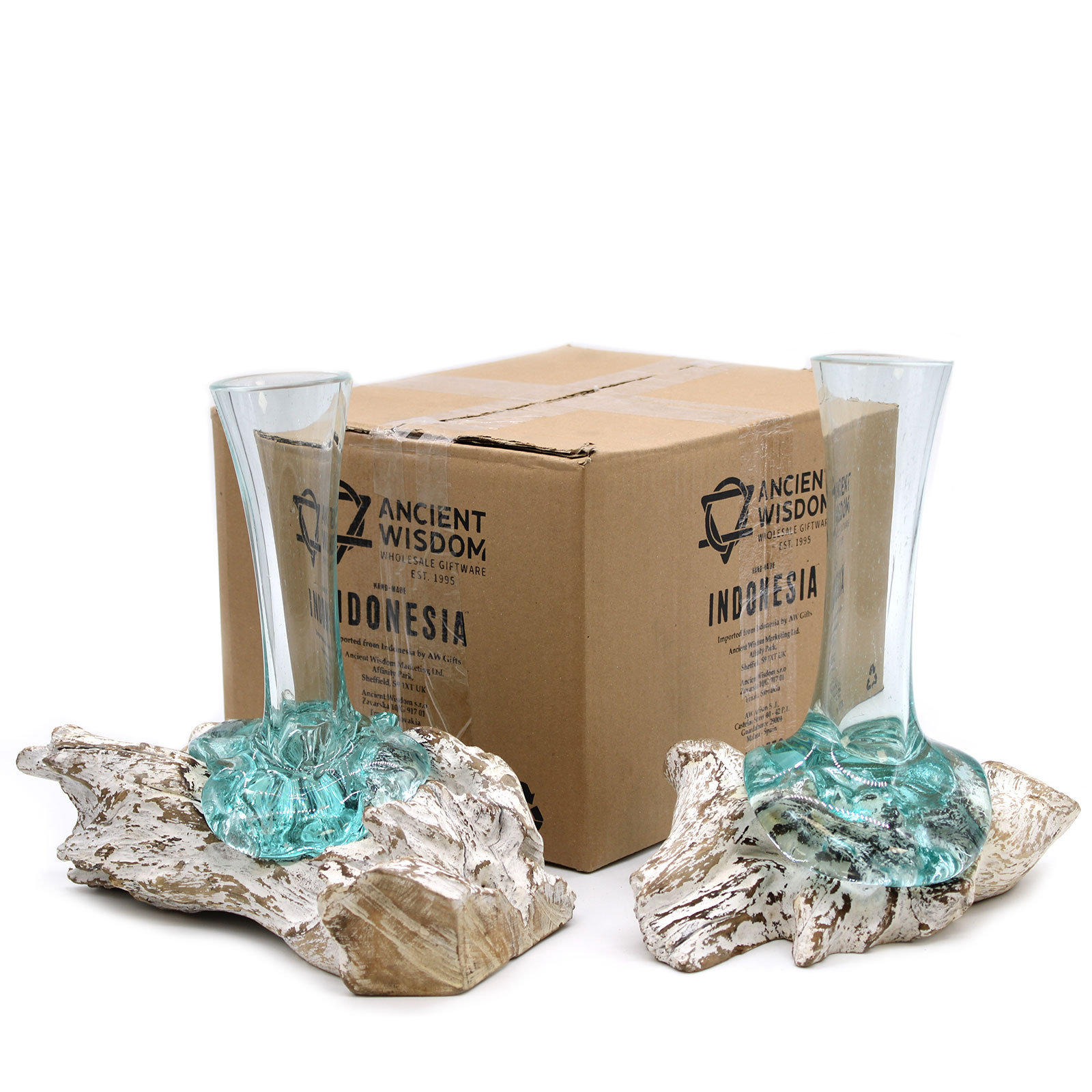 The glass is hand-blown and while still hot it is then relaxed over a piece of Gamal root, the glass then hardens to the shape of the wood ensuring a perfect fit. They are crafted using a natural product by using hand tools in the traditional Balinese way. Each item is unique as they are made from natural sustainable Gamal wood and the recycled glass is shaped to suit which add to its authenticity. Please note: That due to the handmade nature of this product, there can be small imperfections in the glass such as small bubbles, light scratches. Sizes and designs may vary slightly.
