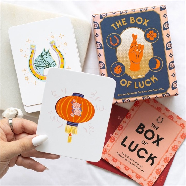 Worried about an interview? Want to ace a presentation? Or perhaps you've got the jitters about a first date? Let The Box of Luck help you attract greater fortune and positive energy into your life with 60 good luck symbols from all around the world. Invite more luck into your life or gift good fortune to a friend with this beautifully packaged boxed set of cards, complete with booklet and lucky fortunes. .
